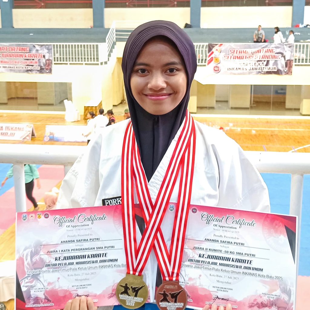 Masih menurut Yogi, sekedar diketahui prestasi Ananda Syafira Putri sebelum ini juga sukses juara di berbagai event regional maupun nasional. Diantaranya, prestasi medali emas sebagai juara satu Jatim cabang olahraga karate dalam kejuaraan Piala Gubernur Jatim 22 Juni 2025 di Sidoarjo. Peraih medali perunggu atau juara tiga Kejuaraan Karate Pertamina Cup Jatim 12-13 Oktober 2024. (humas smk mutu/don)
