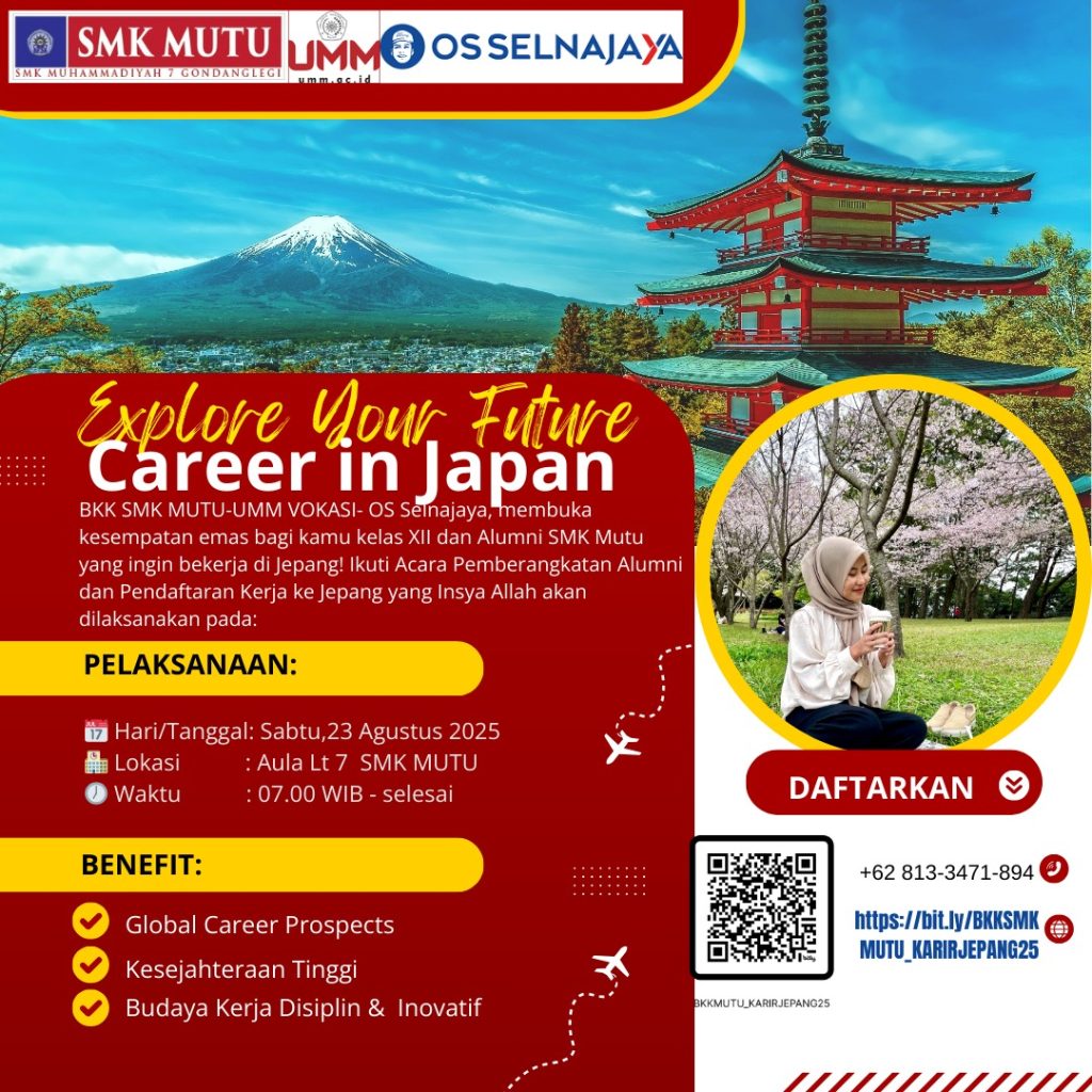 — BKK SMK MUTU bersama UMM Vokasi – OS Selnajaya membuka Pemberangkatan Alumni & Pendaftaran Karir ke Jepang khusus untuk Alumni & siswa Kelas XII SMK MUTU (semua jurusan).