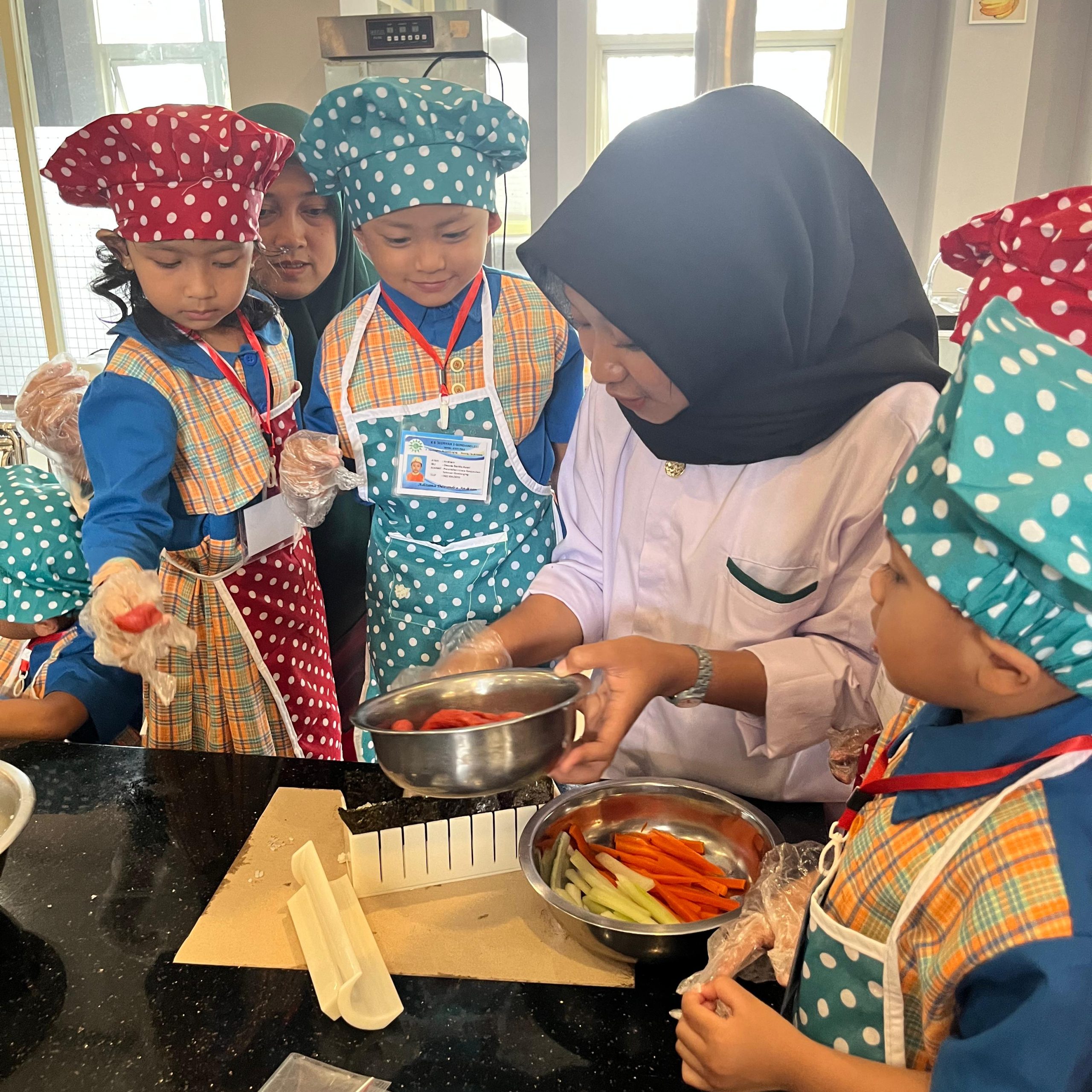 Kegiatan dimulai dengan pengenalan bahan-bahan yang digunakan dalam pembuatan sushi, anak-anak pun sangat antusias untuk mencoba langsung membuat sushi mereka sendiri dengan bimbingan Bapak dan Ibu Guru SMK Mutu. Bapak dan Ibu Guru Pendamping Cooking Class dan Sushi Maker dari SMK Mutu yaitu Ari Damayanti SE., Firdha Amelia, Satria Mandala Putra S.Pd., Alyandari Sekar S.Pd., dan Firlia Wahyu S.Pd. Dalam suasana yang ceria dan penuh tawa, anak-anak tidak hanya belajar memasak, tetapi juga menikmati hasil kreasi mereka bersama teman-teman.