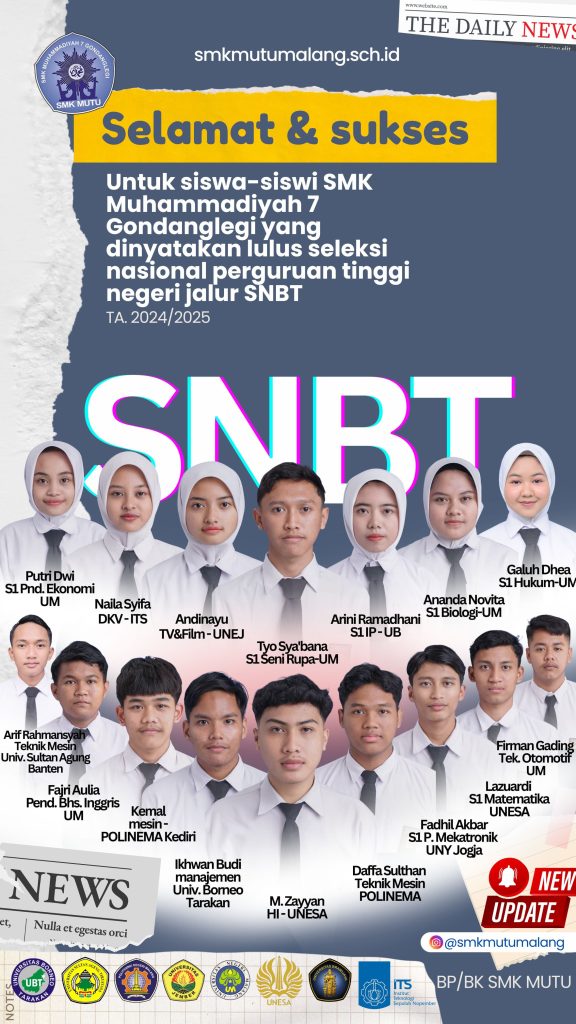 GONDANGLEGI 9 Oktober 2025 — Kabar membanggakan datang dari SMK Muhammadiyah 7 Gondanglegi Malang. Salah satu siswinya, Keifa Dinaya, berhasil lolos seleksi masuk ke sekolah kedinasan bergengsi, Politeknik Siber dan Sandi Negara (Poltek SSN).Prestasi ini menjadi inspirasi bagi teman-temannya serta membawa kebanggaan bagi seluruh warga sekolah. Keifa, siswa jurusan Teknik Mekatronika, berhasil melalui serangkaian tahapan […]