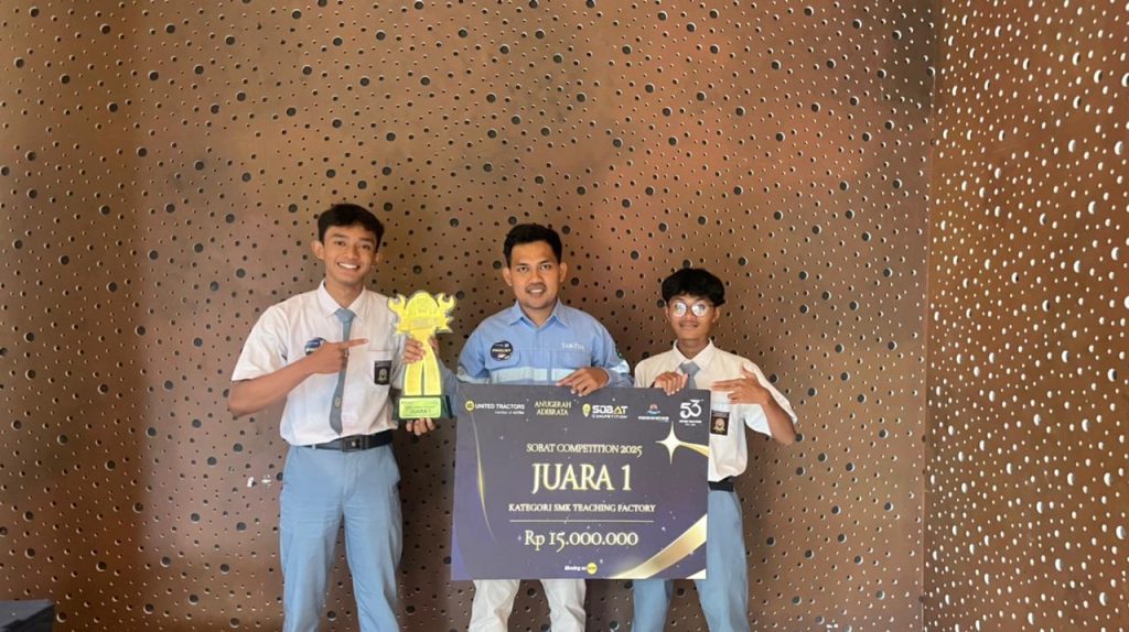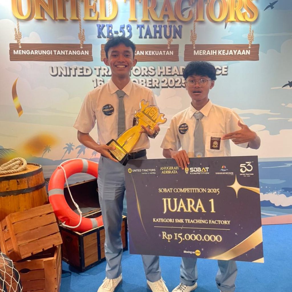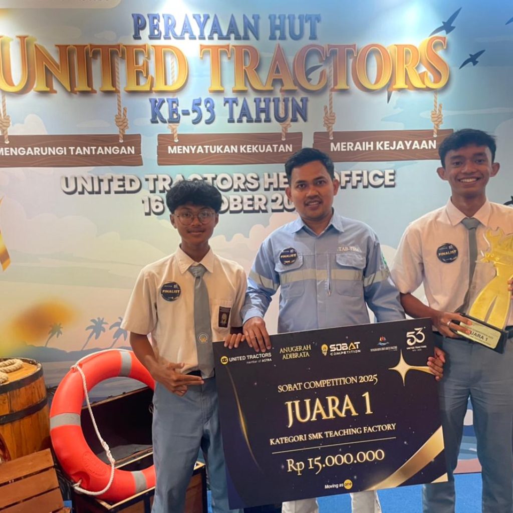 JAKARTA-Jakarta – Alhamdulillah Team SMK Muhammadiyah 7 Gondanglegi (SMK MUTU) berhasil meraih prestasi gemilang dengan menjuarai SOBAT Competition 2025 yang digelar oleh PT United Tractors pada 16 Oktober 2025 di Head Office UT, Cakung, Jakarta Timur. Dalam kategori Teaching Factory, tim SMK MUTU yang dibimbing oleh M. Ghozali, S.Pd. tampil memukau dan berhasil keluar sebagai Juara 1 dengan inovasi “Tefa Mutu Edutel”.